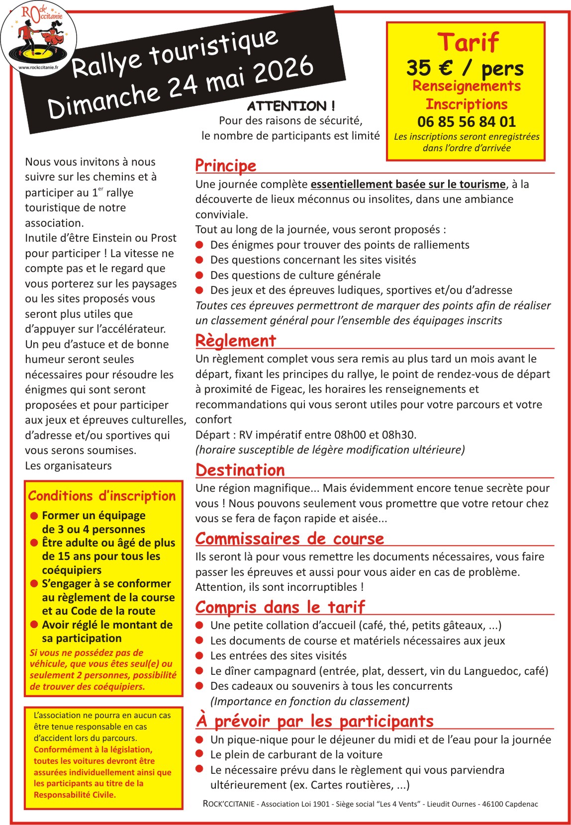 Rock'ccitanie vous propose une journée basée sur le patrimoine et la convivialité. Quelque soit le lieu (connu ou moins connu), vous pourrez découvrir et admirer des éléments que vous ne soupçonniez pas ! Des énigmes, des jeux, des moments de partage vous seront également proposés. Des points seront attribués par épreuve et permettront de gagner des cadeaux (importance selon le classement définitif).