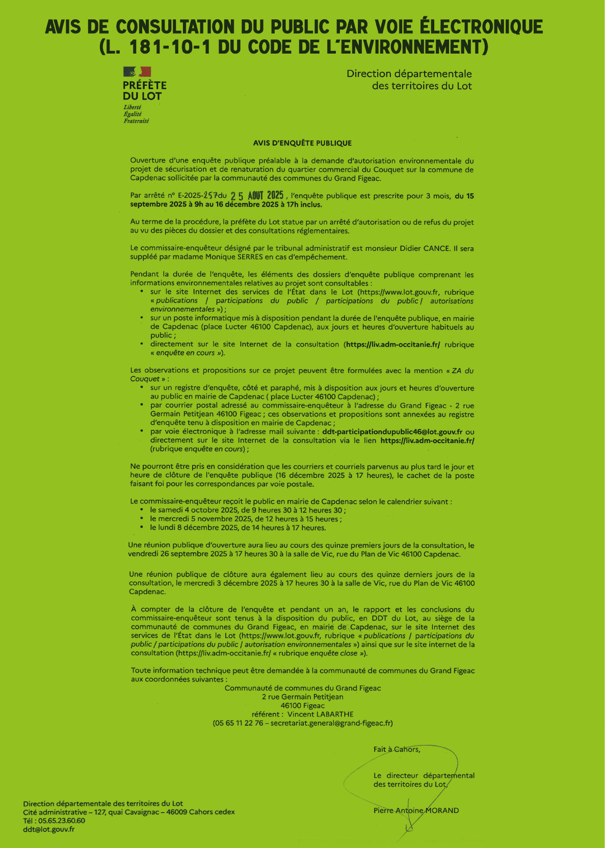 Ouverture d'une enquête publique préalable à la demande d'autorisation environnementale du projet de sécurisation et de renaturation du quartier commercial du Couquet sur la commune de Capdenac sollicitée par la communauté de communes du Grand Figeac.